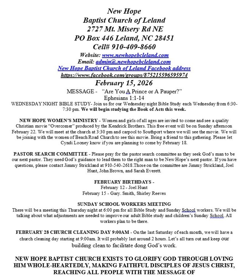 2727 Mt. Misery Rd NE. Leland, NC. 28451 Pastor Robin Looney 910-409-8660