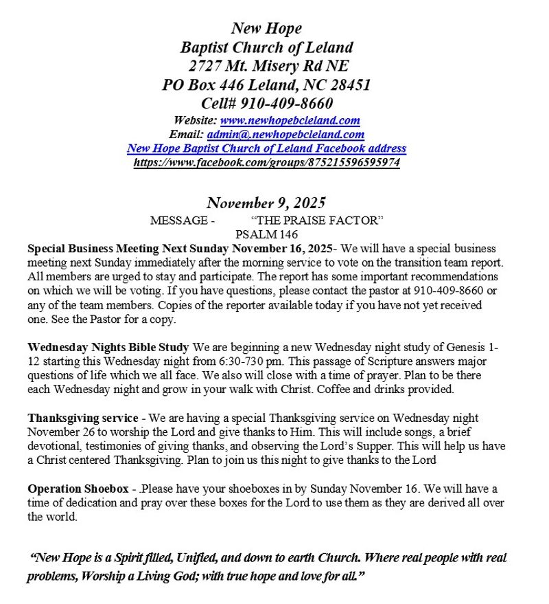 2727 Mt. Misery Rd NE. Leland, NC. 28451 Pastor Robin Looney 910-409-8660