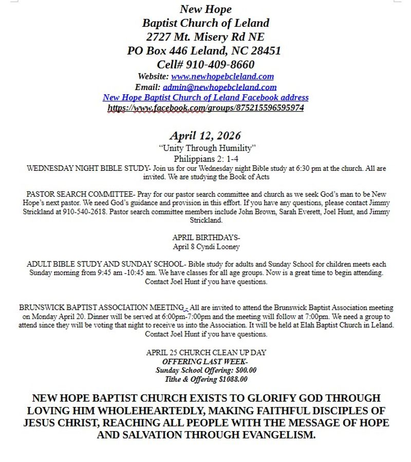 2727 Mt. Misery Rd NE. Leland, NC. 28451 Pastor Robin Looney 910-409-8660